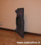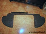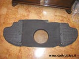 Nella foto a sinistra la moquette del rivestimento dopo esser stata ritagliata. Nella foto al centro il supporto del subwoofer costituito da una sagoma in legno rivestita inferiormente da un foglio di piombo e superiormente da moquette e da una griglia metallica in prossimità del foro di alloggiamento del subwoofer Rockford Fosgate RFR-1412 a scopo protettivo. Nella foto a destra come si presentano insieme la moquette+supporto .
