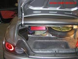 Il bagagliaio della Honda S2000 ha una capacità di circa 150 litri ed una forma piuttosto irregolare. Al centro si trova un sagoma di polistirolo all'interno della quale trovano posto il crik auto, cacciaviti ecc. Una volta rimossa lascia il posto ad un "pozzetto" semisferico rivestito in moquette dal volume di circa 30 litri. Nelle foto sopra la moquette del rivestimento viene rimossa dopo averla stata ritagliata in prossimità del "pozzetto".