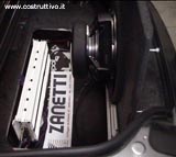 Nella foto a sinistra il subwoofer Rockford Fosgate RFR-1412 fissato al supporto in legno rivestito in piombo, da notare l'enorme magnete e il foro di areazione della bobina mobile capace di digerire potenze elevatissime. Nella foto a destra come si presenta il "pozzetto" una volta "foderato" completamente con fogli smorzanti della Rockford fosgate e occupato dei due bianchi amplificatori ZAPCO serie STUDIO.